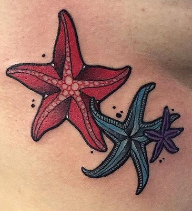 7. Bright Red and Blue Cluster Starfish Tattoo