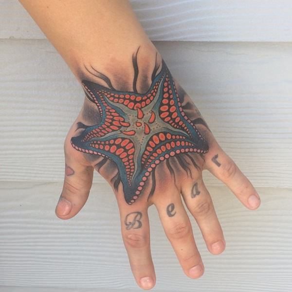 21. Bold Red and Blue Hand Starfish Tattoo