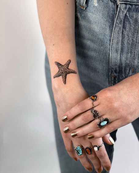 This one has a cool, spontaneous edge that makes it feel instantly modern. The starfish itself is detailed and natural, but those splattered ink accents around it give the whole design a looser, more artistic energy. It feels like a sketchbook idea that made its way onto skin in the best possible way. If you want something with personality, this definitely has it. It still carries the familiar meaning tied to resilience and renewal, but the finish is less a polished beach souvenir and more a creative studio mood. That mix makes it one of the more distinctive starfish tattoo ideas in the set.