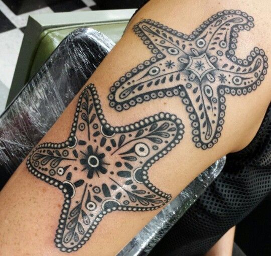 These starfish feel less like simple beach tattoos and more like wearable art. The decorative details give them a handcrafted, almost folk-inspired beauty, and the pair creates a lovely sense of rhythm across the skin. They have that polished boho energy that feels stylish, grown-up, and a little soulful. Instead of leaning realistic, these designs embrace ornament, which opens the door to a different kind of meaning—one tied to creativity, individuality, and the idea of carrying beauty with you every day. For women especially, this kind of design feels expressive without becoming overly delicate.