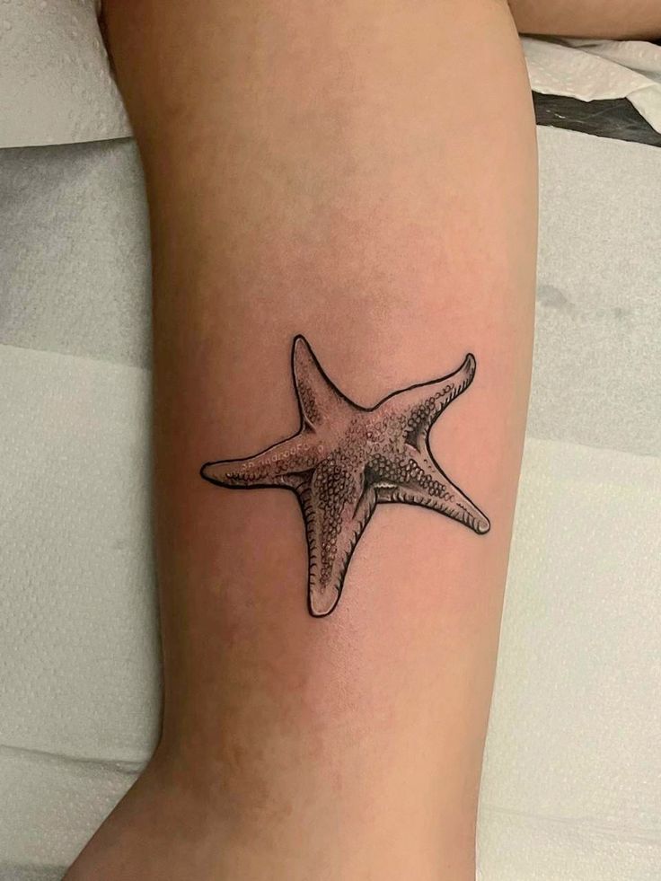 This one feels grounded and beautiful in such an effortless way. The shading is soft, the texture is natural, and the overall look has that sun-warmed, sandy realism that makes a starfish tattoo feel intimate instead of flashy. There’s a calm confidence to it, like choosing a piece that doesn’t need bright color or extra embellishment to be unforgettable. It quietly leans into meaning, whether that means healing, resilience, or simply feeling connected to the sea. Among starfish tattoo ideas, this is the kind that feels timeless because it’s based on form and texture rather than trend. It’s elegant, wearable, and just a little bit seductive on the thigh.