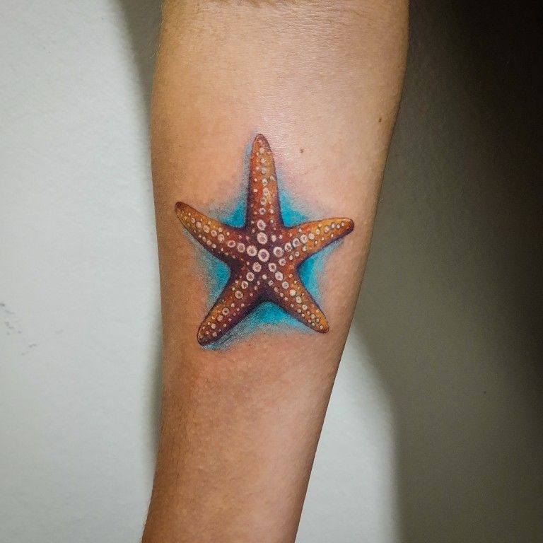Now this one has presence. It feels vivid, sunlit, and just a touch dramatic in the best possible way, like the starfish was lifted straight from shallow tropical water and placed gently onto the skin. The warm texture in the body paired with that bright Blue wash around it gives the whole tattoo a fresh, aquatic glow. It’s one of those starfish tattoo ideas that instantly reads as confident and expressive without losing the natural beauty of the creature itself. There’s a realism here that feels playful rather than stiff, and that makes it especially appealing if you want something lively, memorable, and full of movement.