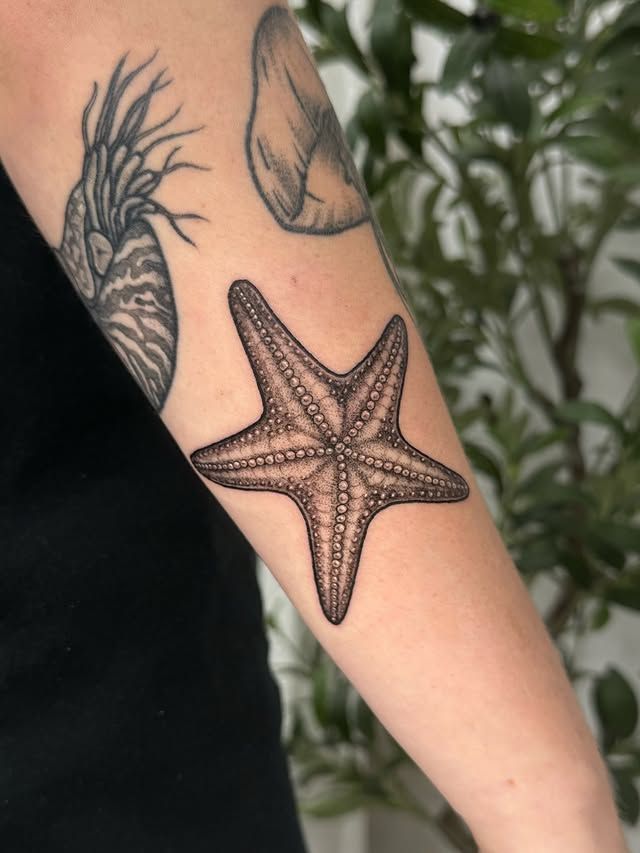 This final design leans into texture in such a satisfying way. The dot shading and rounded surface detail give the starfish a realistic, almost touchable finish, but the overall look stays clean and wearable. It has a calm, grounded beauty to it that feels less trendy and more lasting, which is often exactly what makes a tattoo feel right years later. There’s no extra fuss here, just strong shape, balanced detail, and a natural sense of depth. For men or for women who prefer neutral ink, this is one of those ideas that quietly carries meaning while still feeling stylish. It’s polished, coastal, and mature in the best sense of the word.