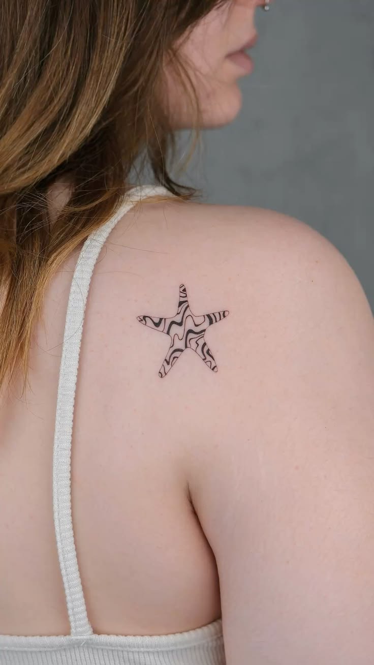 There’s something quietly magnetic about a starfish tattoo that doesn’t try too hard. This one feels modern, artsy, and a little dreamy, like a tiny piece of ocean energy translated into a chic gallery-style sketch. The flowing pattern inside the shape gives it that fresh-from-the-beach, fresh-from-a-life-reset kind of mood. It reads as one of those starfish tattoo ideas for women who love subtle beauty but still want a design with personality. Set on the shoulder, it has that easy elegance that peeks out of tanks, swimsuits, and soft summer dresses without ever feeling loud. It’s simple at first glance, but the longer you look, the more interesting it becomes.