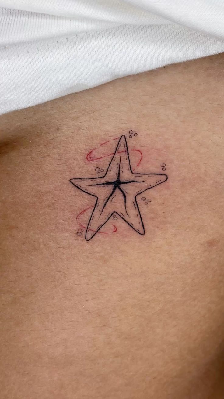 This little design feels clean, modern, and refreshingly unfussy. The starfish shape is understated, the black detail is minimal, and the soft red accents around it give the whole tattoo a loose sketchbook charm, almost like a quick Design drawing brought to life on skin. It is one of those starfish tattoo ideas that feels especially easy to wear because it does not try to do too much. There is a quiet confidence in that. It feels personal, stylish, and just a bit artsy, like something chosen for its mood as much as its meaning.