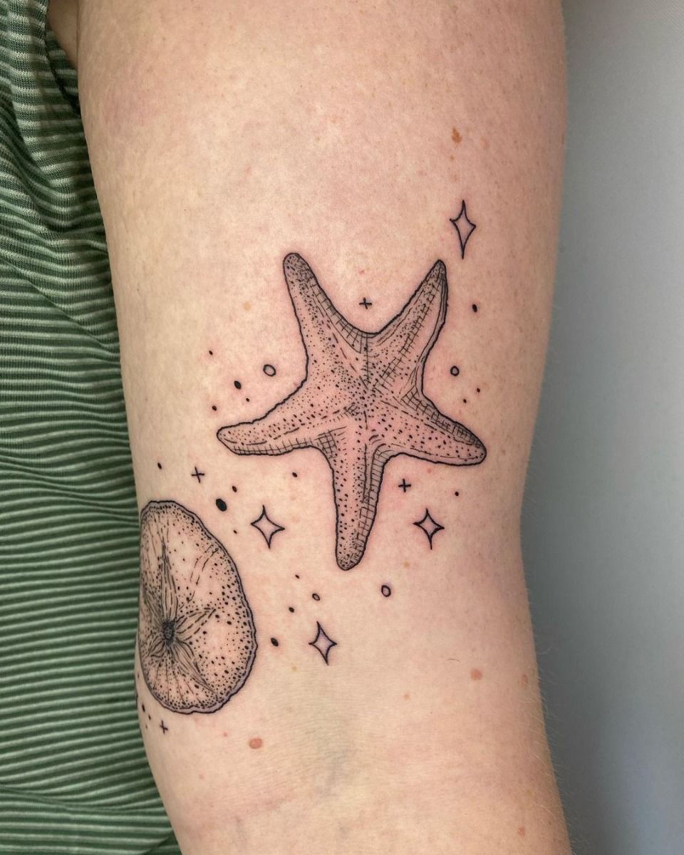This design feels soft, dreamy, and just a little magical. The starfish itself has a gentle realism, but those tiny surrounding sparkles shift the mood into something more personal and poetic. It is not just about the sea anymore—it starts to feel like memory, intuition, and a quiet kind of wonder. That is what makes this one of the more emotionally resonant starfish tattoo ideas in the batch. It does not shout for attention, but it definitely has a presence. There is something really lovely about the way it mixes ocean symbolism with a slightly celestial mood.