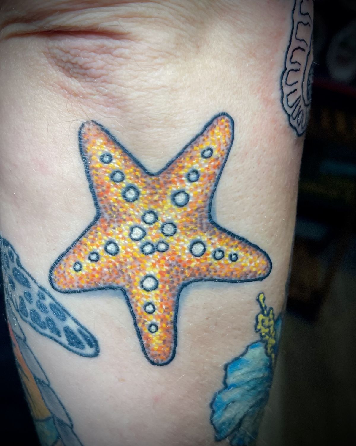 This one has such a happy, punchy personality. The orange and golden dotwork almost makes the starfish look sunlit from within, and that black outline gives it a crisp, confident finish. It feels cheerful without being childish, which is not always easy to pull off. If you love tattoos that bring a little energy to your overall style, this is one of those starfish tattoo ideas that knows exactly what it is doing. It has a hint of Traditional charm, but the texture keeps it feeling fresh and lively. It is bold, fun, and impossible to ignore in the best way.