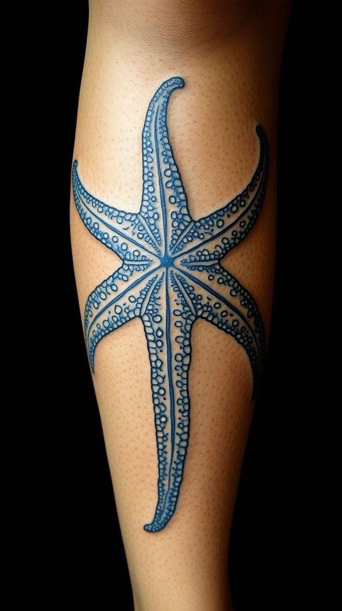4. Long Blue Starfish Leg Statement Tattoo