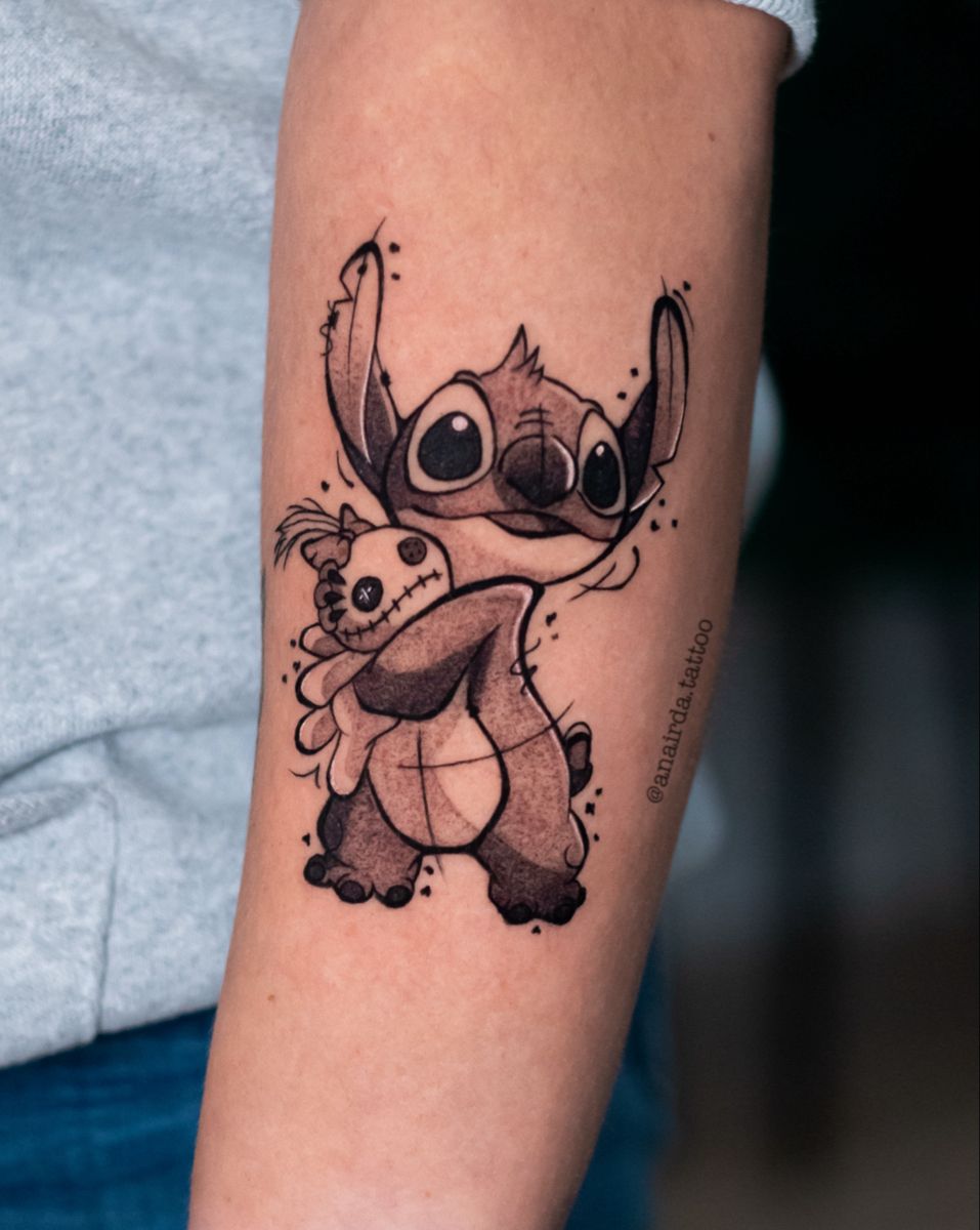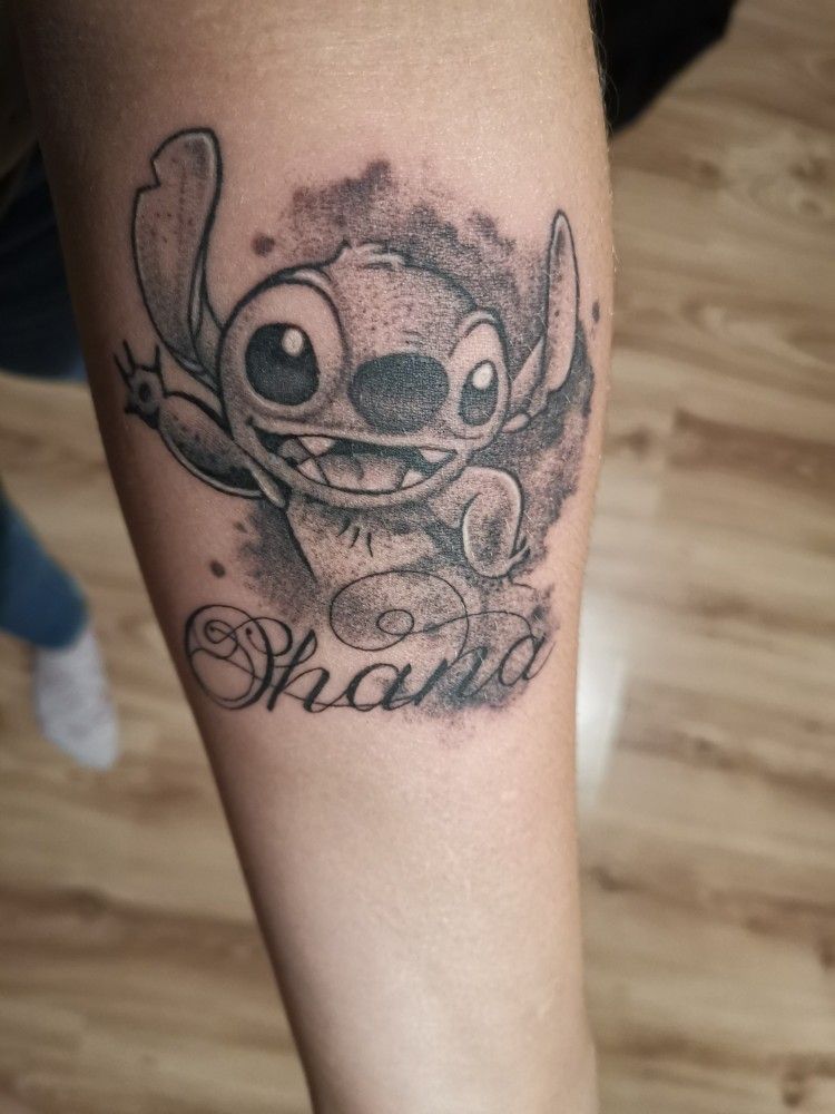 This piece feels deeply personal, almost like a memory captured in ink. The soft shading around Stitch creates a smoky, emotional atmosphere, while the elegant script name adds that intimate touch—like you’re carrying a story with you. It’s expressive without being loud, and that balance is what makes it so beautiful.