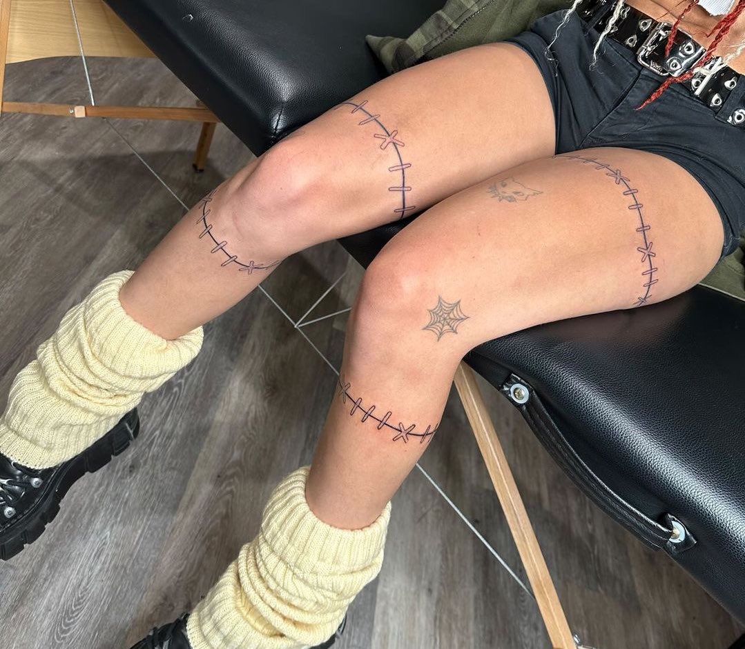 This one feels bold in the most unexpected way — like you’ve turned your body into a canvas of storytelling. The stitched lines wrapping around the thigh create a visual illusion that’s equal parts edgy and fashion-forward. It’s not trying to be delicate; it’s making a statement, and honestly, it’s hard not to admire that confidence.