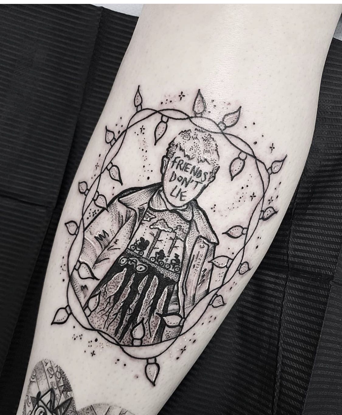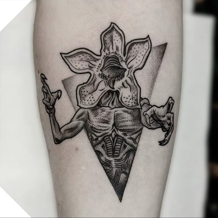 This tattoo leans into pure Stranger Things mythology. The Demogorgon emerges from a clean diamond shape, feeling iconic and timeless, almost like a symbol rather than a creature. It’s intense but controlled, giving off a calm-before-the-storm energy that makes it endlessly intriguing.