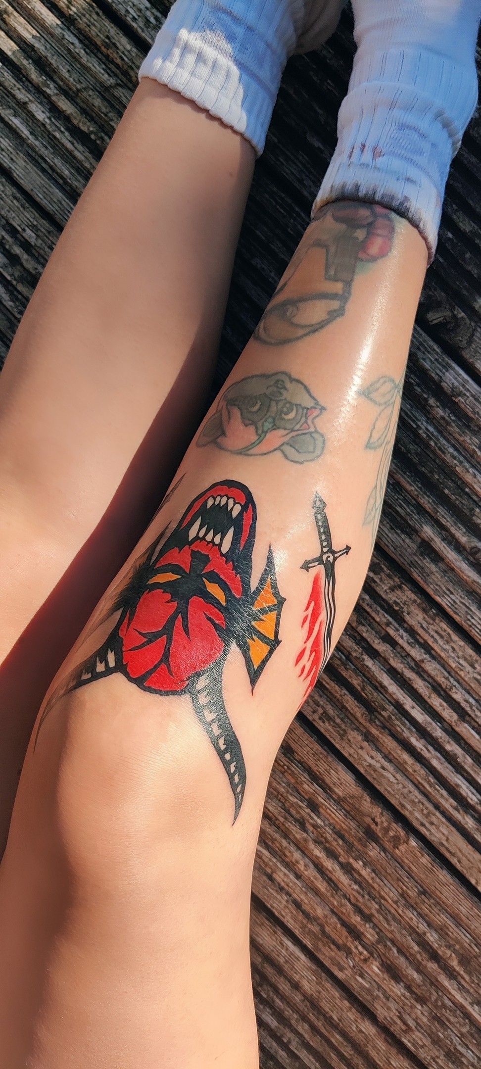 What makes this design special is its commitment to contrast and color. The sharp black outlines and saturated red keep it striking from a distance. It’s a great option if you’re drawn to bold ideas and want something that refuses to blend in, especially on the calf or outer leg, where movement brings it to life.