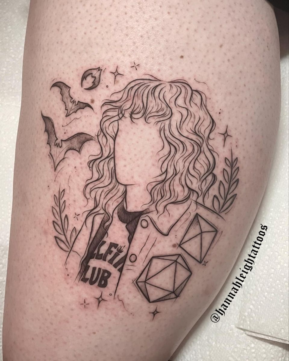 This tattoo is powerful in a quiet, almost unsettling way. Eleven appears calm, introspective, and even regal, while danger blooms above her. It captures that duality she embodies—vulnerability and strength coexisting. It’s artful, feminine, and intense without being loud.
