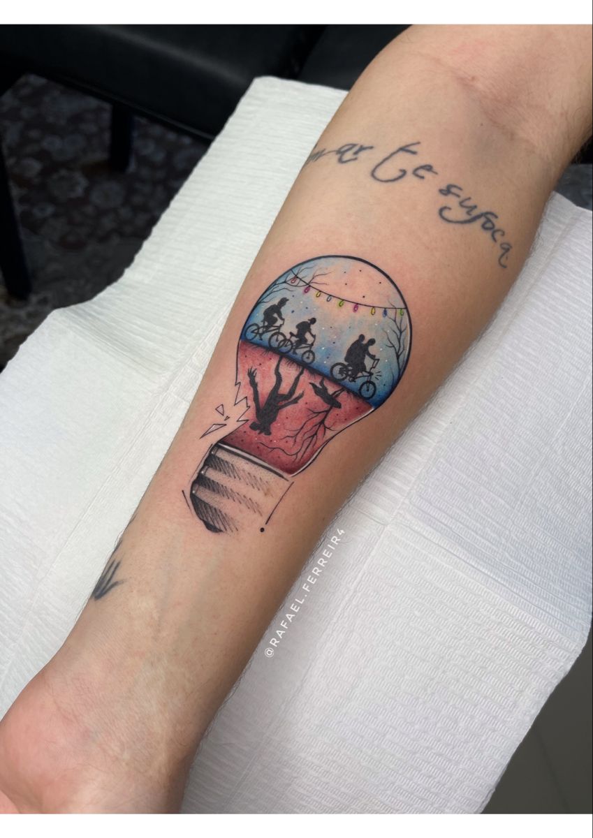 This one feels like pure nostalgia bottled into ink. The glowing lights, the bikes, the split world—it instantly takes you back to that feeling of discovery and danger mixed with friendship. It’s playful but dramatic, a full narrative wrapped into a single design that says you didn’t just watch the show, you lived in it for a while.