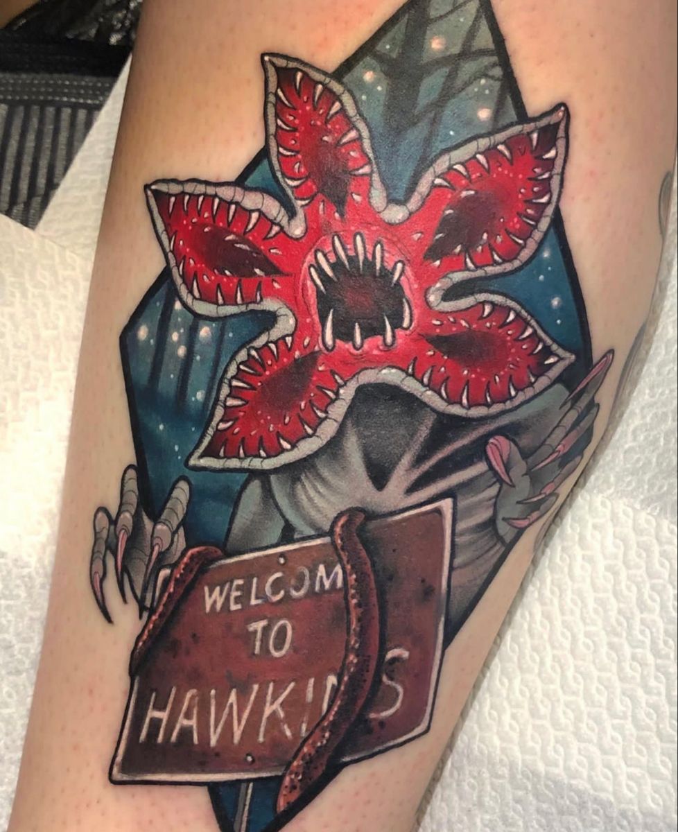 This tattoo feels like a full-blown postcard from Hawkins—if Hawkins had a horror tourism board. The Demogorgon bursting through the welcome sign is bold, theatrical, and a little tongue-in-cheek. It captures the town’s charm and terror in one unforgettable moment.