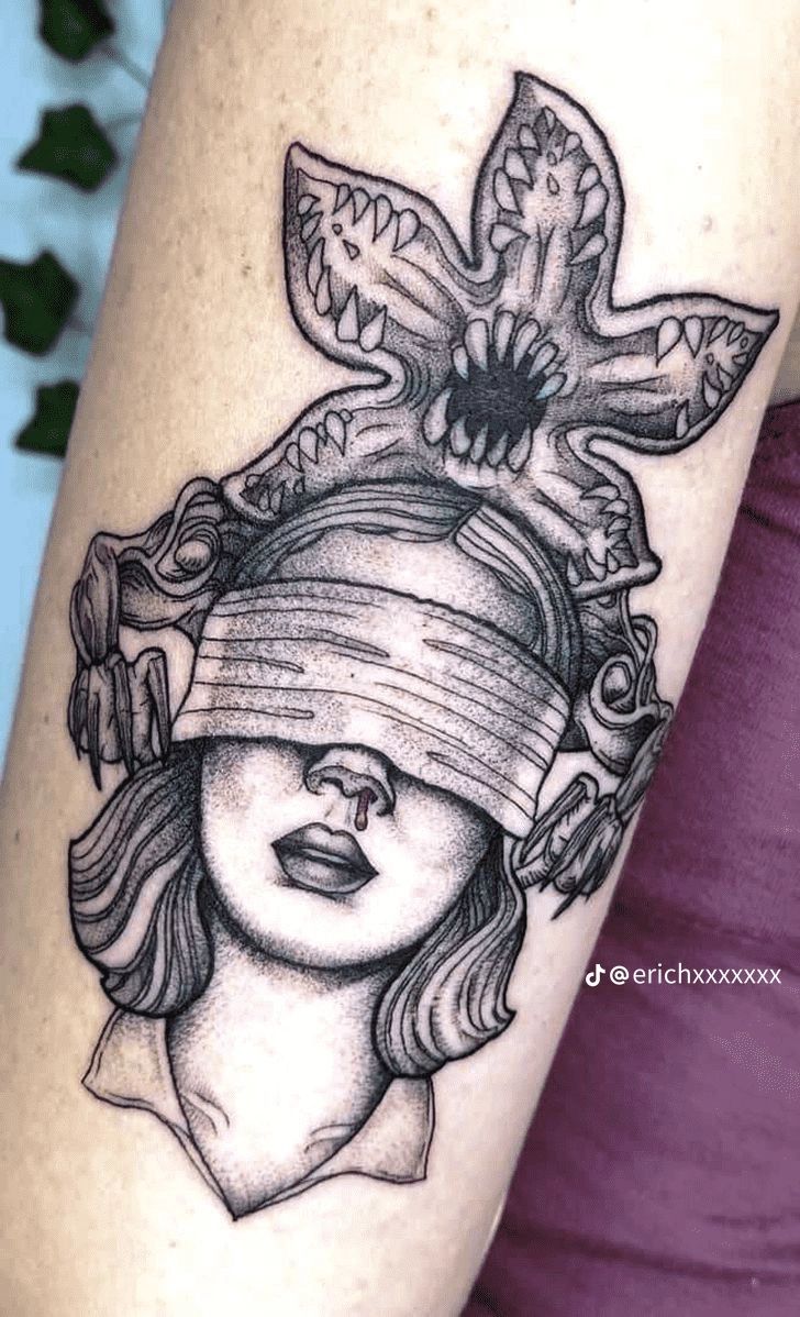 Because of its depth and shading, this design suits medium to large placements. It’s perfect for fans of 11 and Eleven who appreciate symbolism over literal portraits. Black and gray realism keeps it sophisticated, making it a strong option for those who want meaningful Stranger Things tattoo ideas without heavy color.
