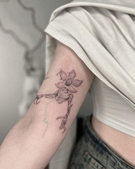 This works beautifully for someone drawn to minimalist ideas without losing emotional depth. Fine-line shading keeps it wearable on the forearm or calf, and it ages well thanks to the controlled contrast. If you love minimalist tattoos but still want a strong Stranger Things reference, this design balances darkness and grace effortlessly.
