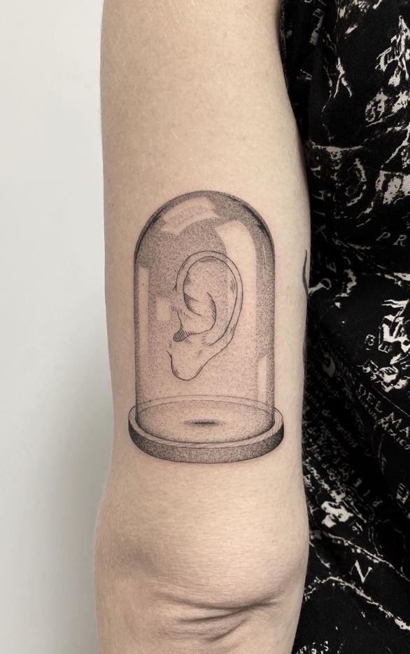 This piece is strange in the best possible way. A single ear suspended under a glass dome sounds a little surreal on paper, but the tattoo shading makes it feel oddly elegant instead of gimmicky. The soft gradients inside the bell jar create that fragile, preserved quality, almost like a tiny specimen from a beautifully curated cabinet of curiosities. I love tattoos like this because they feel intellectual and slightly eerie without needing a lot of noise. It is simple, yes, but not plain. The dome, the subtle shadow at the base, and the careful rendering of the ear all work together to create a quiet kind of drama that pulls you in the longer you look at it.