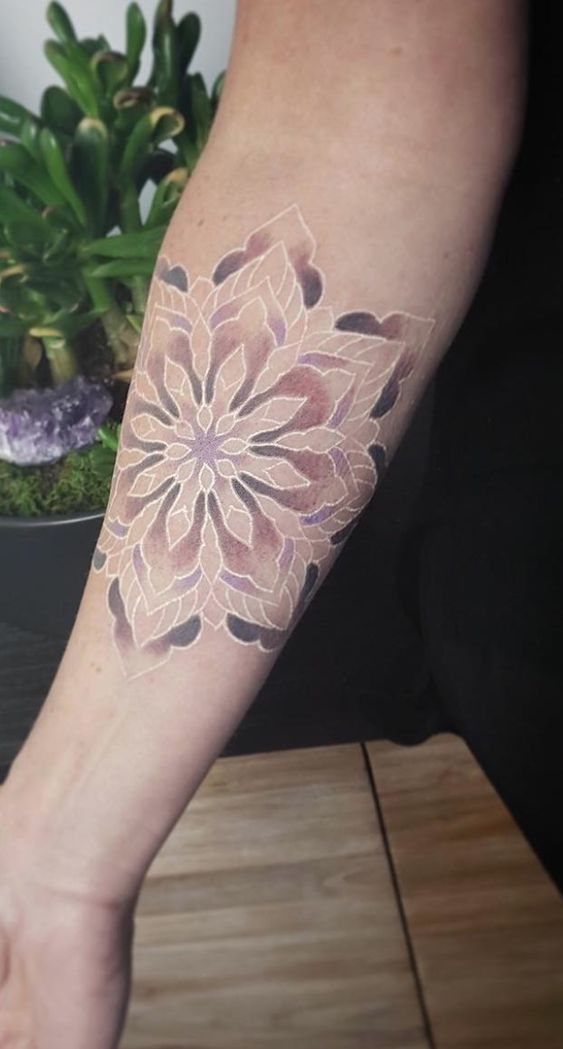 This tattoo has such a dreamy, almost powdered finish that it barely feels like ink at first glance. The floral geometry opens across the arm like a soft exhale, with pale layered petals and just enough depth in the outer forms to keep everything from disappearing into the skin. It feels gentle, graceful, and a little romantic without turning sugary. I really like tattoo shading that whispers instead of shouts, and this one absolutely does that. The whole design has a calm, meditative energy, like something between a Flower and a mandala, with those faint tonal shifts doing all the emotional work. It feels personal, feminine, and incredibly light on the body.