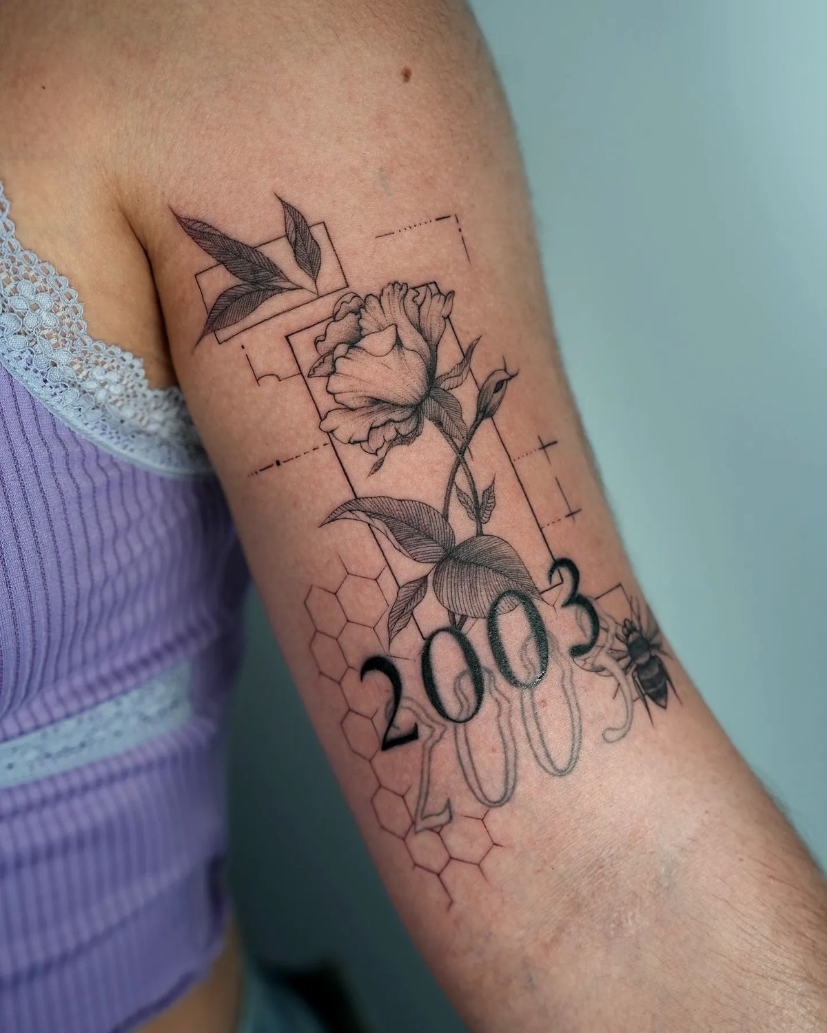 This design has such a personal, curated feel to it. The Flower, the year, the bee, the geometric framing, the honeycomb detail—all of it comes together like a tiny story rather than a random collection of symbols. What keeps it elegant is the tattoo shading. Without those soft shadows in the petals and leaves, the piece could feel busy, but the grey work gives it cohesion and a gentle rhythm. It reads sentimental without being overly obvious and artistic without trying too hard. I especially love how the numbers are softened by the floral line work around them. It feels thoughtful, modern, and deeply wearable, like a memory dressed up in a very stylish outfit.