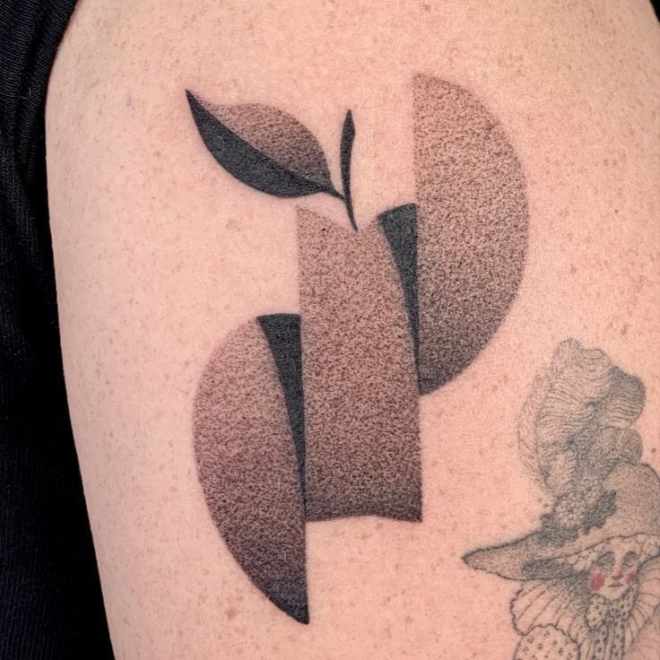 This tattoo is proof that minimal does not have to mean boring. The geometric forms feel crisp and intentional, but the dot shading softens them just enough to keep the whole piece from feeling cold. I love the tiny leaf detail at the top because it turns what could have been purely abstract into something a little more organic and human. The result is clean, stylish, and quietly clever. It almost reads like modern wall art translated onto skin, which makes it feel very current without chasing trends too hard. There is restraint here, and honestly, that is its strength. The design breathes, the shading does not crowd the eye, and the whole thing feels calm in the best possible way.