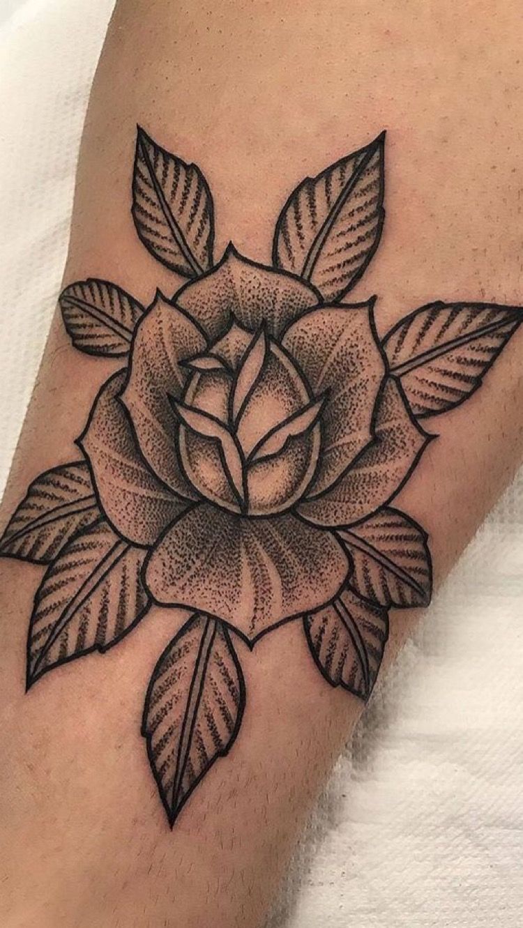 A Rose like this never really goes out of style, and this one proves exactly why. The petals are bold and sculptural, but the dot shading softens the structure just enough to make the flower feel rich instead of rigid. I love the balance here between classic and modern. The overall silhouette is timeless, almost Traditional in spirit, yet the texture gives it a fresher finish that feels very now. The leaves framing the bloom help it sit beautifully on the skin, and the use of shadow inside the center petals draws your eye straight in. It is romantic without being sugary, polished without feeling precious, and strong in a way that works on almost anyone.