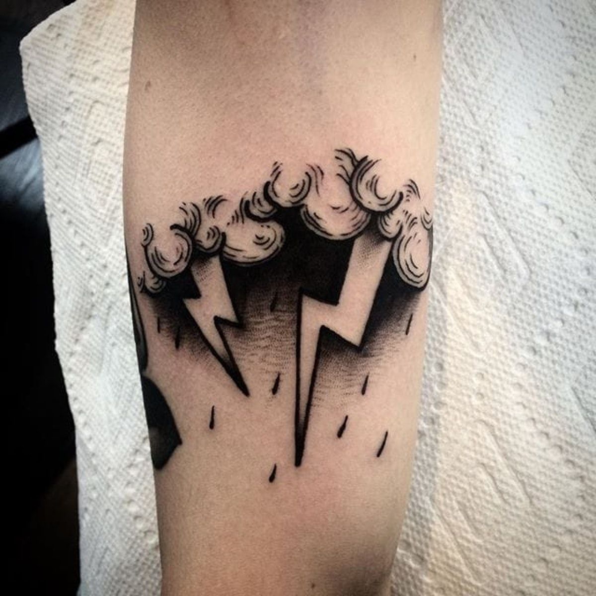 The vibe here is bold and self-aware, perfect for someone who likes graphic styles with a little bite. It works especially well on the arm because the long vertical lines of the rain and lightning keep the composition moving instead of sitting too stiffly. If you are thinking about filler ideas for a sleeve later, a design like this can also bridge larger pieces beautifully because the Cloud and rain elements naturally extend into a Background. Ask your artist for solid blacks and soft, smoky drop-shadow work beneath the top line so the storm feels dimensional. It gives off a cool, stormy attitude without trying too hard.