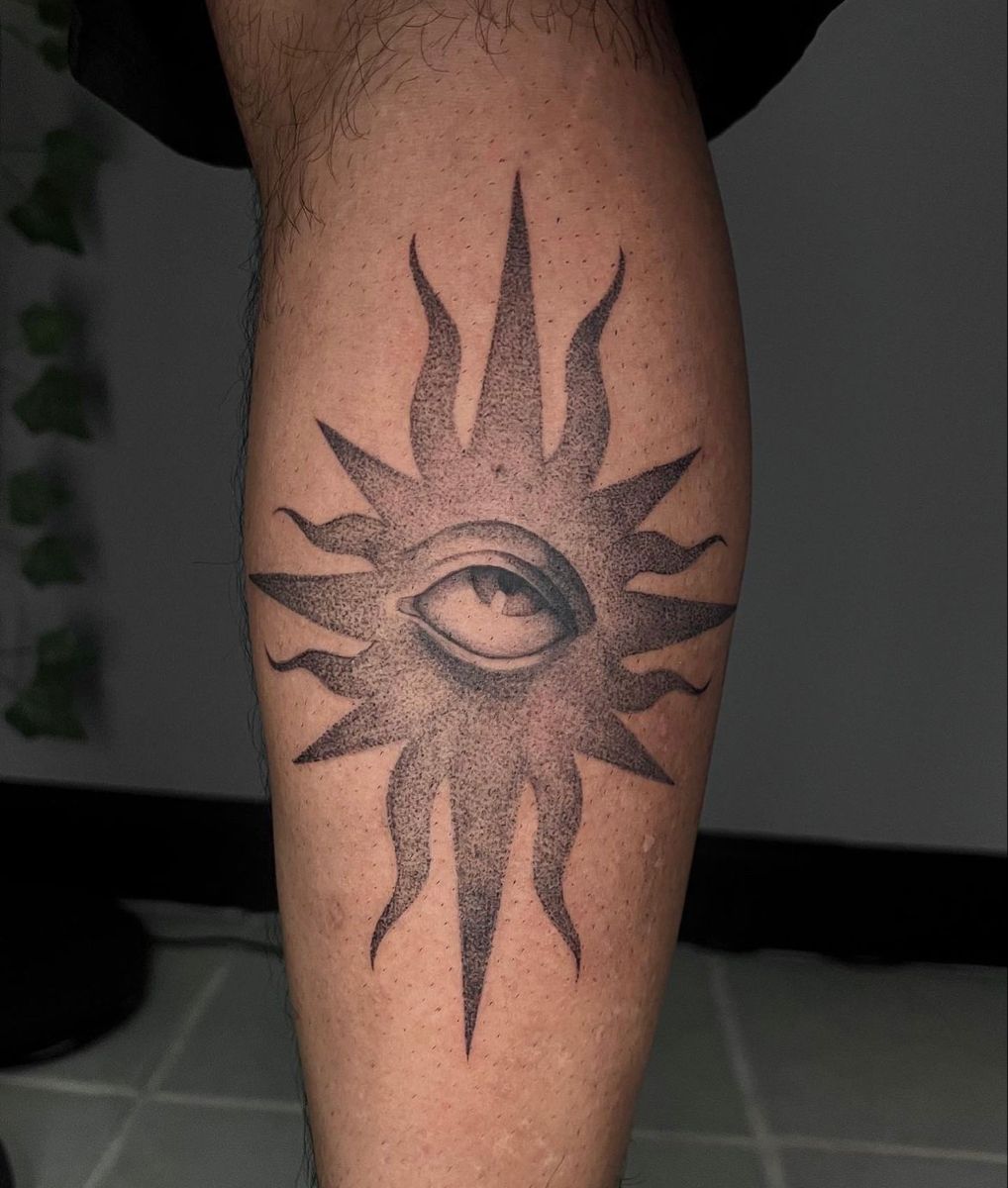 This Sun tattoo has that beautiful in-between mood where something mystical still feels clean and wearable. The eye at the center gives it a watchful, intuitive energy, while the pointed rays keep the whole design sharp and graphic instead of overly dreamy. What really makes it sing is the tattoo shading. The soft stippled fade around the eye and through the rays creates depth without turning the piece heavy, so it still feels open on the skin. It is bold, but not loud. Symbolic, but not cliché. There is something quietly magnetic about a design like this, like it carries its own little universe without needing extra decoration to explain itself.
