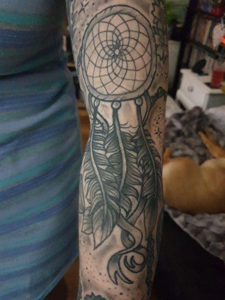 This dreamcatcher piece has a more lived-in, expressive feel, and that gives it real character. The circular web at the top brings structure, while the feathers below soften everything and add that swaying sense of movement. The tattoo shading here is not trying to be ultra-clean or cosmetic. It feels more atmospheric, which works beautifully for a design that is already symbolic and a little dreamy. I like that the feathers are shaded enough to feel dimensional without becoming heavy, and the dotted accents around the piece help it settle into the skin naturally. There is something comforting about it. It feels personal, a little mystical, and very grounded in emotion rather than trend.