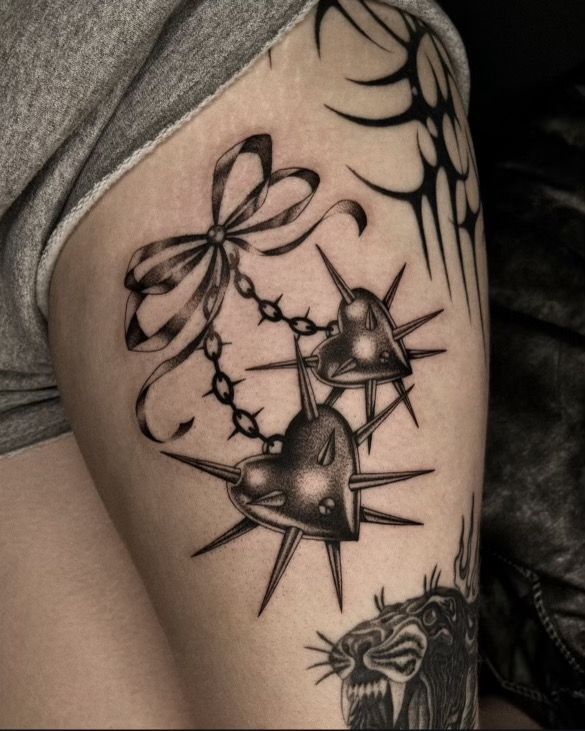 16. Spiked Hearts and Bow Chain Tattoo