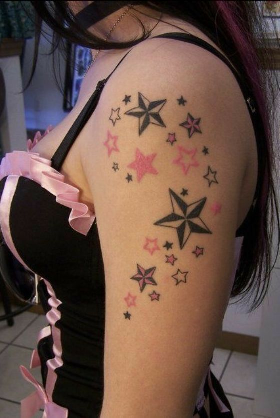 This star-filled Arm moment is pure Y2K in the best way—like glossy lips, a flip phone charm, and your favorite playlist all at once. The mix of bold black stars with pops of pink feels playful and a little Flash, but still surprisingly wearable. It’s giving “fun trouble,” not “trying too hard,” which is exactly what makes Y2K tattoo ideas feel fresh again.