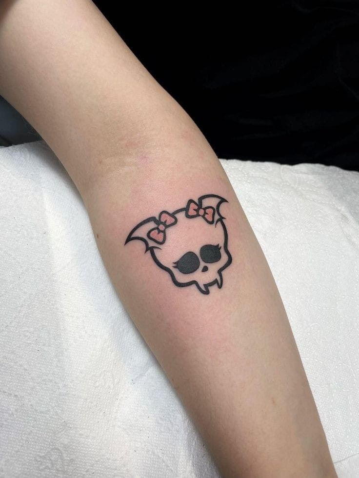 This little batwing skull is giving cute chaos—like the girly goth side of Y2K that never stopped being fun. The bows soften the whole look so it feels playful instead of scary, and the bold outlines make it read like a sticker from your teenage notebook brought to life. It’s sweet, edgy, and weirdly charming all at once, which is basically the holy trinity of Y2K tattoo ideas.