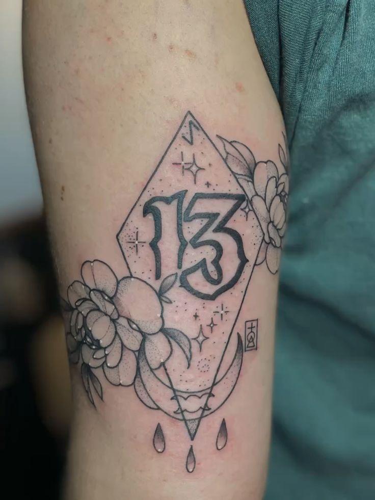 This design takes 13 and turns it into something dreamy, artistic, and a little magical. The number sits inside a diamond frame, softened by flowers, tiny celestial accents, and that curved moon detail below, so the whole tattoo feels less like a label and more like a personal talisman. It has a gentle feminine pull, but not in a sugary way. It is thoughtful, stylish, and layered, the kind of piece that makes people lean in because there is always one more detail to notice.