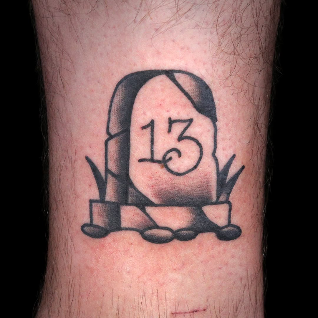 This tombstone-inspired 13 tattoo leans all the way into moody symbolism, and honestly, that is what makes it so good. It feels dark, witty, and beautifully old-school, like a little tribute to every spooky movie, late-night thought, and beautifully weird instinct you have ever had. The stone shape, the base details, and the soft shading around the number—all of it gives the tattoo a storybook quality. It is dramatic, yes, but not in a messy way. It feels considered, graphic, and full of personality.