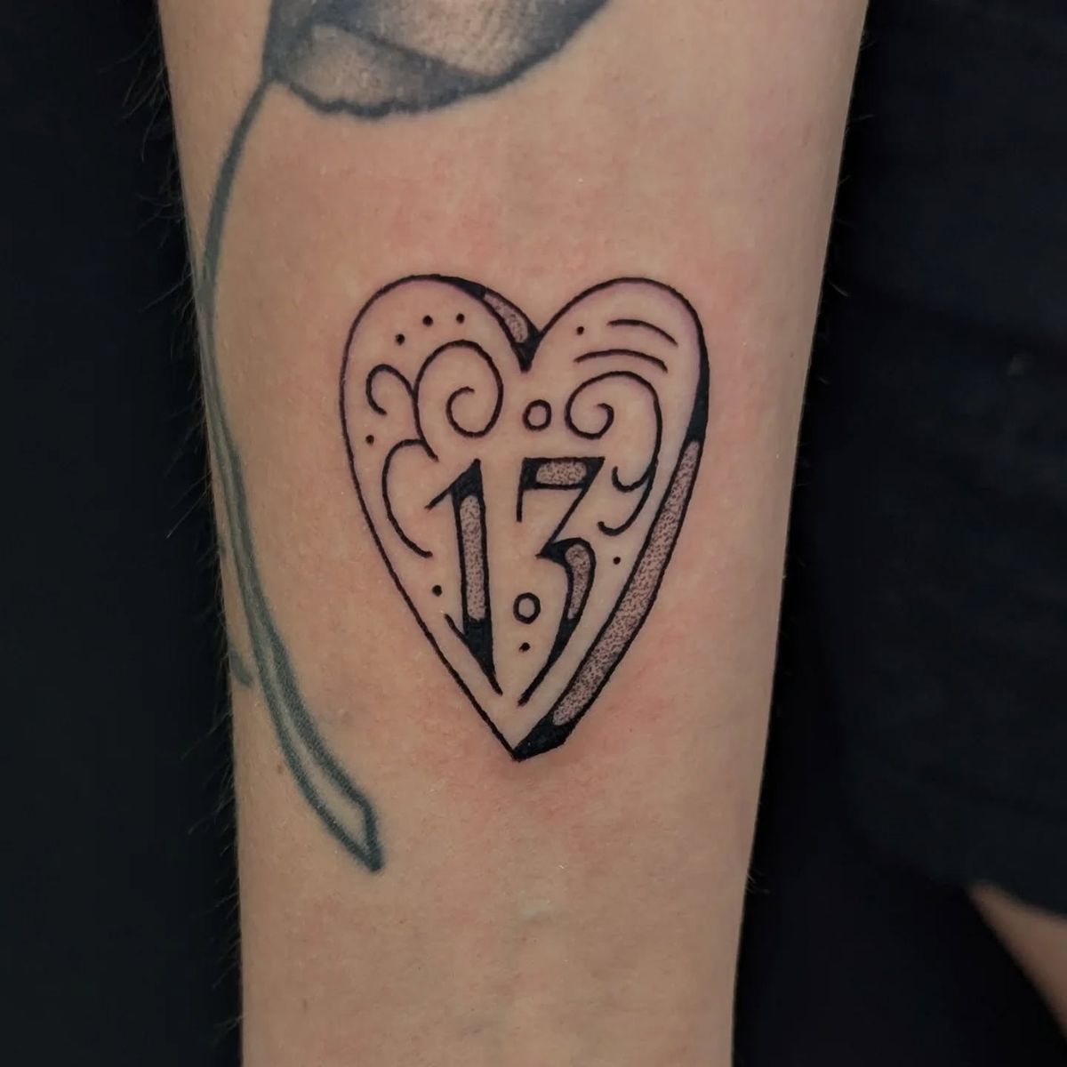 A heart around 13 gives the number a completely different emotional tone. It feels affectionate, sentimental, and a little nostalgic, but still cool enough to avoid becoming too sweet. The swirled details make the shape feel almost handmade, like a doodle turned into something permanent because it meant too much to leave behind. There is charm in that. This kind of tattoo does not try to look tough or mysterious. It leans into softness, memory, and attachment, which can actually make it far more powerful than a darker version of the same number.