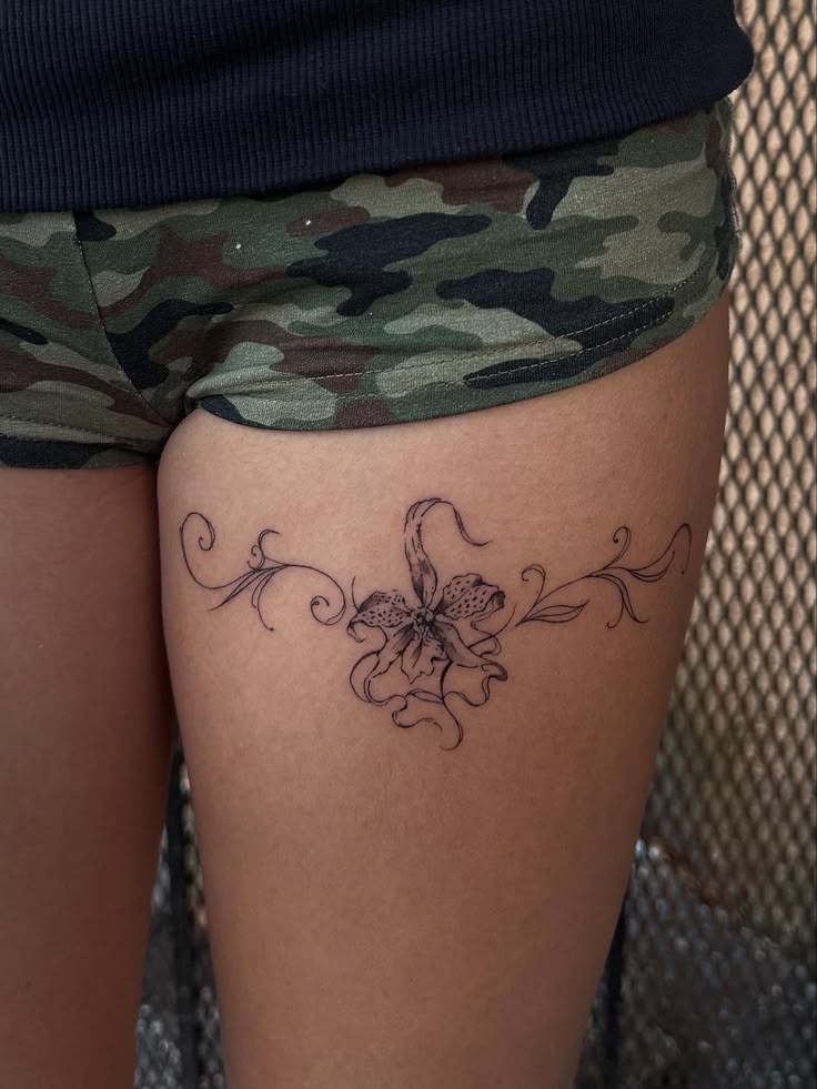 This flowing lily design feels romantic and slightly vintage, with its curling stems and gentle shading. It sits beautifully across the back of the thigh, almost like a decorative garter made of ink. There’s something timeless about floral ornamentation that never feels outdated.