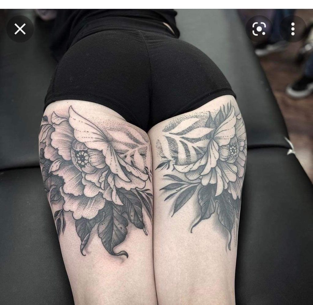 These back-of-thigh tattoo ideas work beautifully for women who want larger coverage without committing to a full sleeve. The shading technique flatters most skin tones and ages gracefully, especially when done in soft black and grey. Pair it with high-waisted shorts or a sleek swimsuit and let the placement do the talking. It’s an especially lovely choice for women who are unique flower lovers who want elegance with presence.