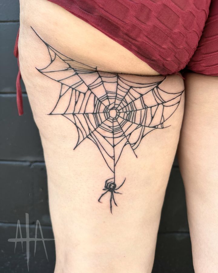 A dramatic spiderweb stretching across the back of the thigh feels edgy and unapologetic. The geometry naturally follows the curve of the body, creating a bold silhouette. It has that slightly rebellious energy that makes you feel fearless.
