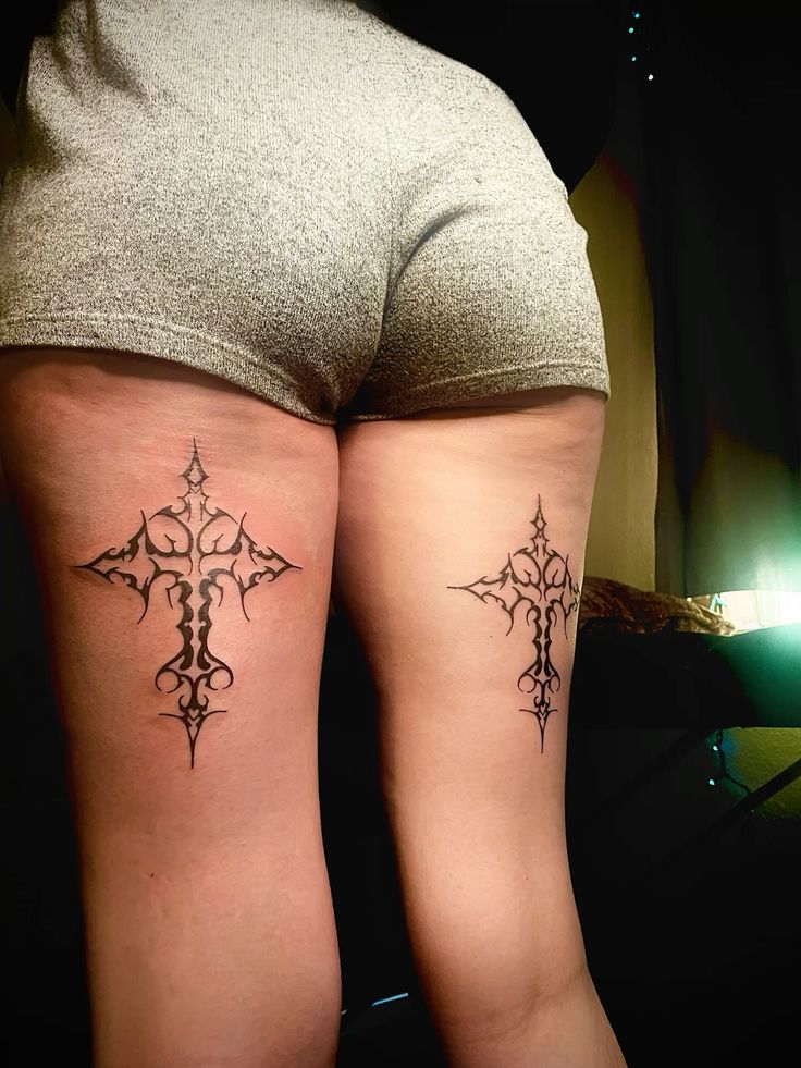 Two ornate crosses placed symmetrically on the back of each thigh create a bold, gothic-inspired look. The sharp edges and intricate detailing give it a cathedral feel—dramatic yet balanced. It’s a design that carries weight, both visually and symbolically.