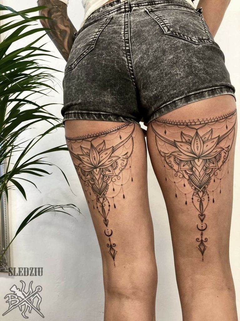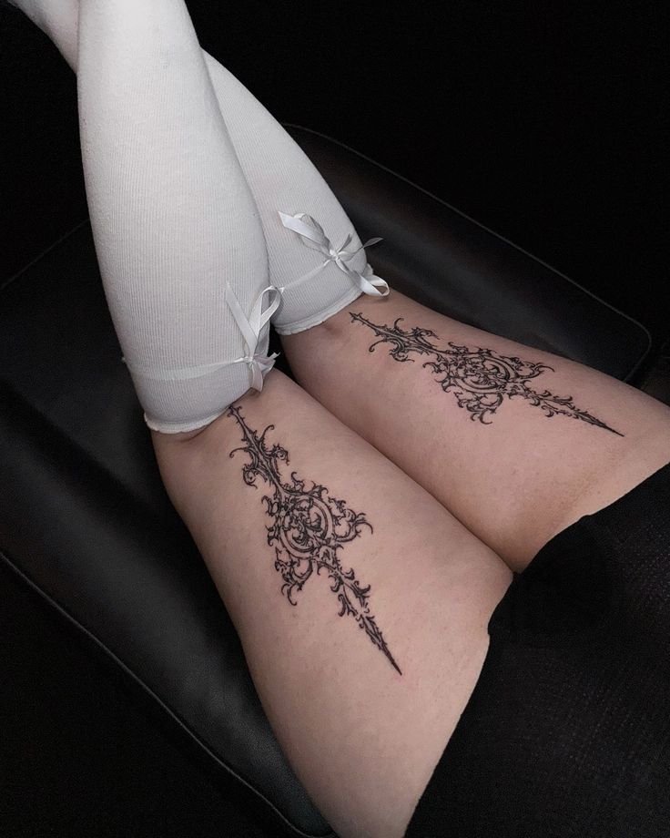 This elongated ornamental design running down each thigh feels refined and almost regal. The intricate curves and fine detailing resemble antique jewelry—delicate but powerful. It’s the kind of tattoo that makes you stand a little taller, like you’re wearing invisible lace etched into your skin.