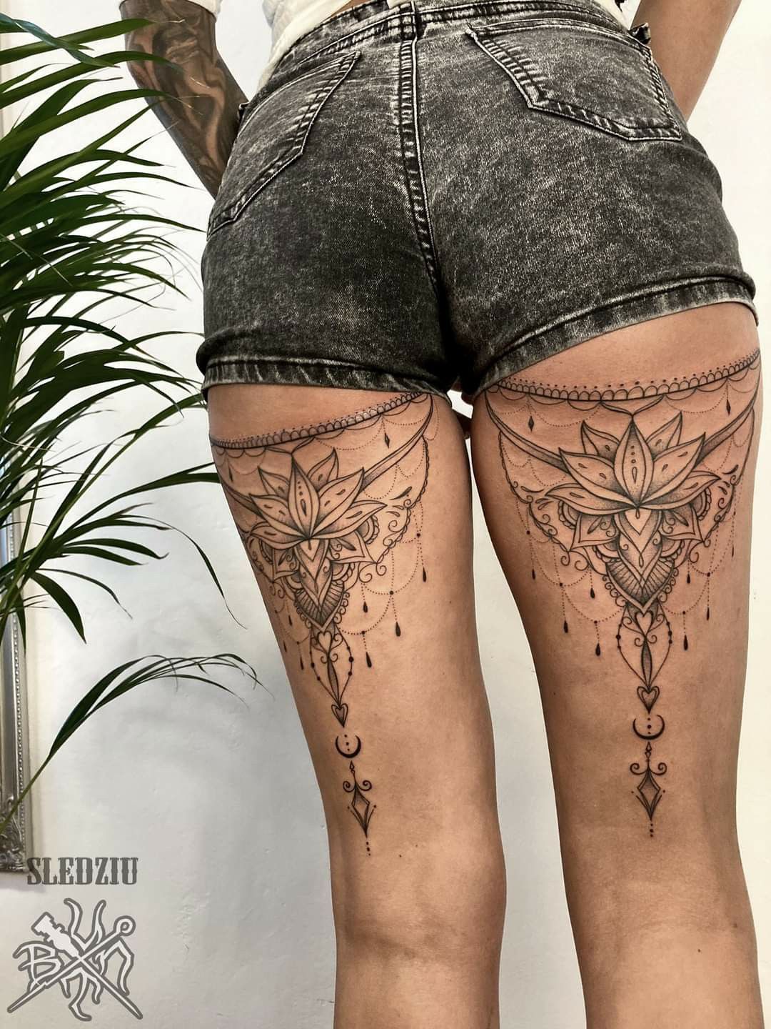 This elongated ornamental piece running vertically down the back of each thigh feels almost regal. The delicate curves and intricate details give off cathedral-inspired elegance without being overly heavy. It’s the kind of design that feels like antique jewelry carved into skin—dramatic yet graceful.