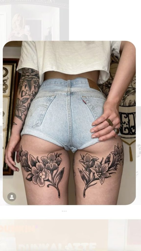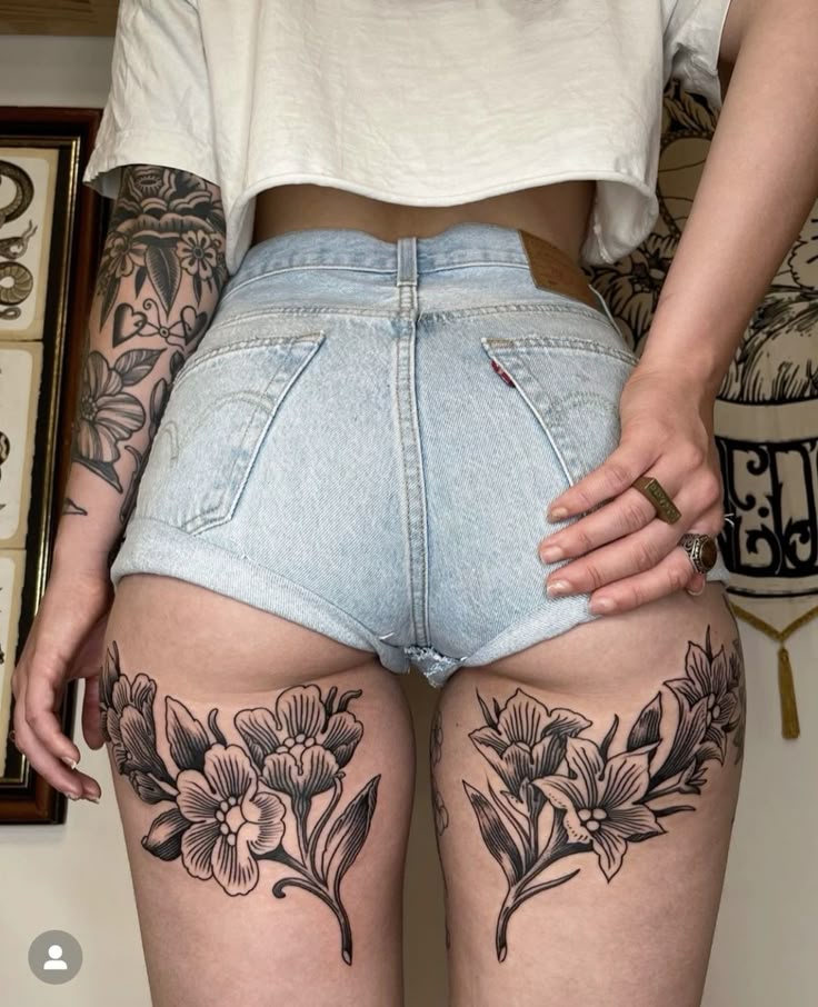 Two large blossoms placed high on the thighs create a look that feels confident and fashion-forward. There’s something effortlessly cool about florals peeking out beneath denim shorts. It blends softness and edge—like wearing fresh flowers with combat boots. These back-of-thigh tattoo ideas feel modern and undeniably stylish.