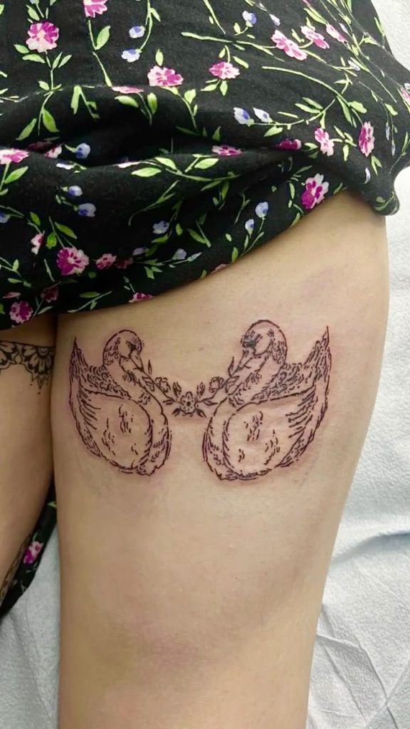 Two swans facing each other across the back of the thigh feel poetic and intimate. The symmetry creates harmony, while the delicate linework gives it a vintage illustration vibe. It’s romantic without being overly sweet—more storybook than cliché. This kind of design feels deeply personal, like a symbol of connection carried quietly.