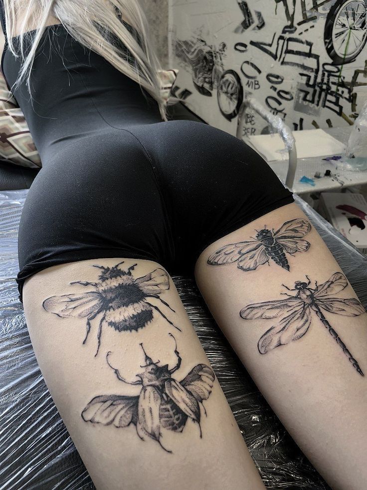 There’s a quiet drama to finely detailed insects resting across the back of the thighs. A bee, a dragonfly, a beetle—each one feels like a tiny piece of natural history art. The delicacy of the linework contrasts beautifully with the strength of the placement. It’s the kind of tattoo that sparks conversation without trying too hard.