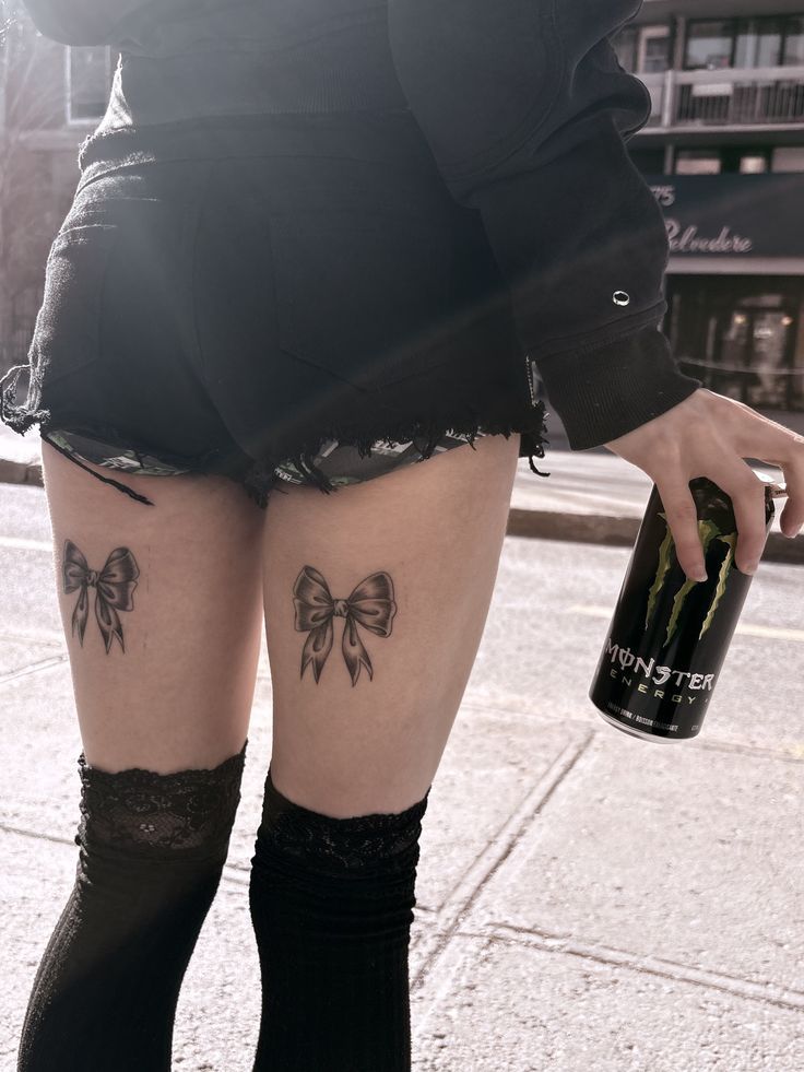 Two softly shaded bows on the back of the thighs feel flirty and nostalgic—almost like a permanent accessory. They bring a playful energy, giving off subtle pin-up vibes without going full retro. It’s cute, but in a self-aware way. You can feel the confidence behind it.