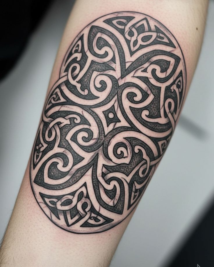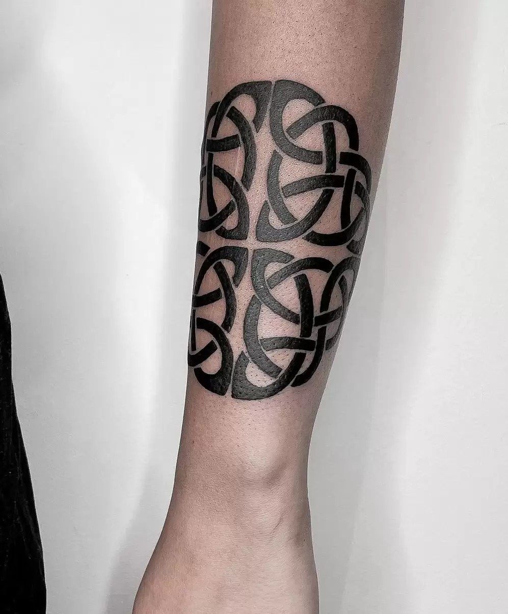 This design is a labyrinth of loops and curves—a mesmerizing patchwork of Celtic patterns that feels ancient and artistic. The oval shape frames the knotwork beautifully, making it look almost like a protective emblem. It’s the kind of tattoo you can stare at for a while and still discover new details.