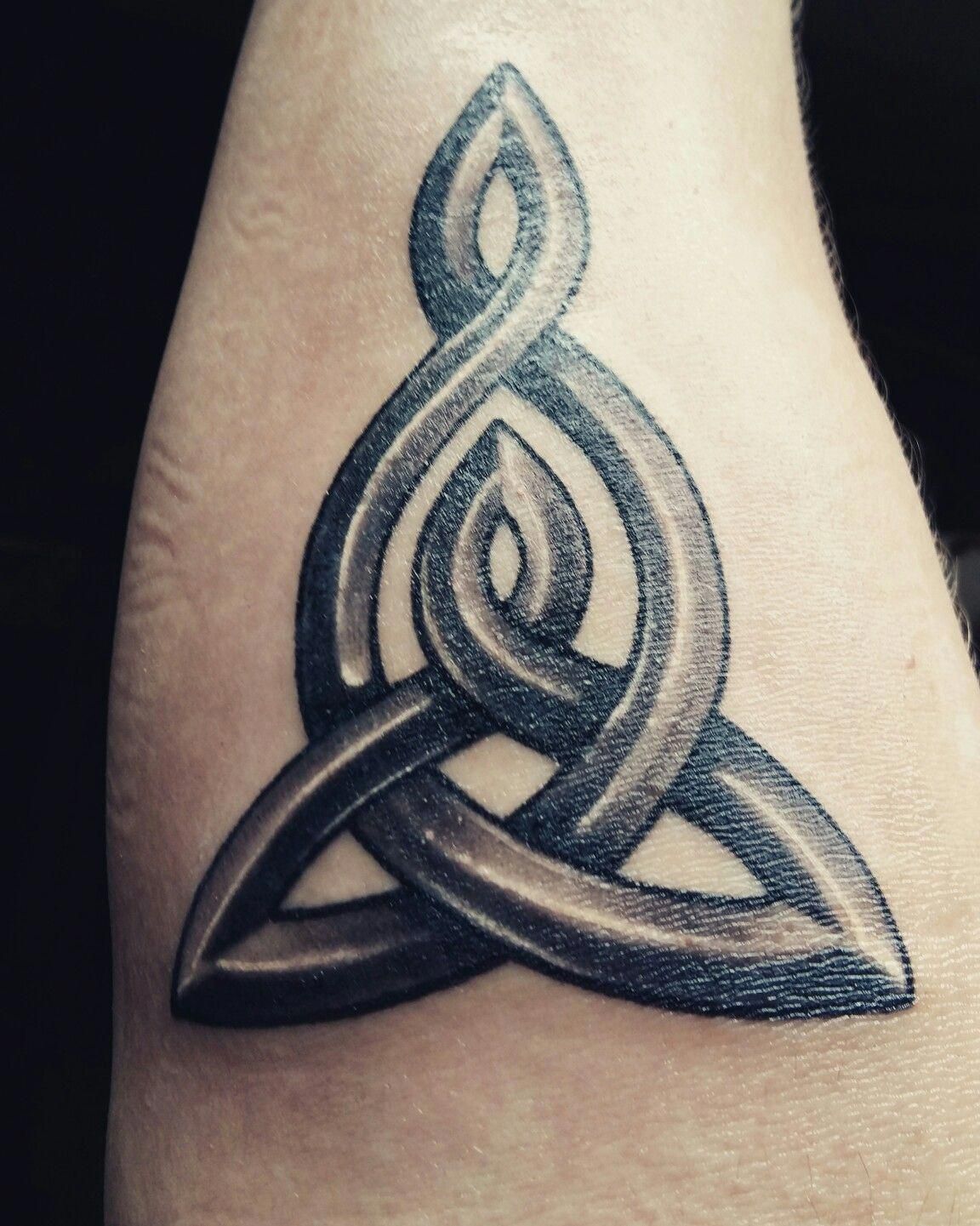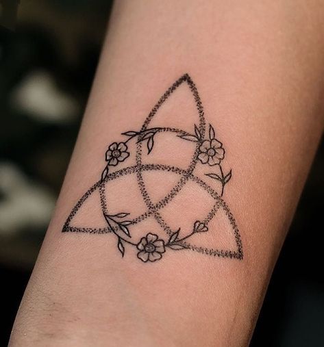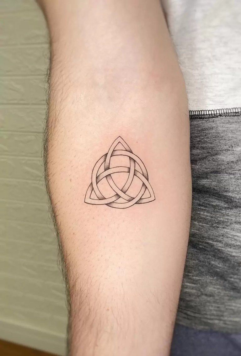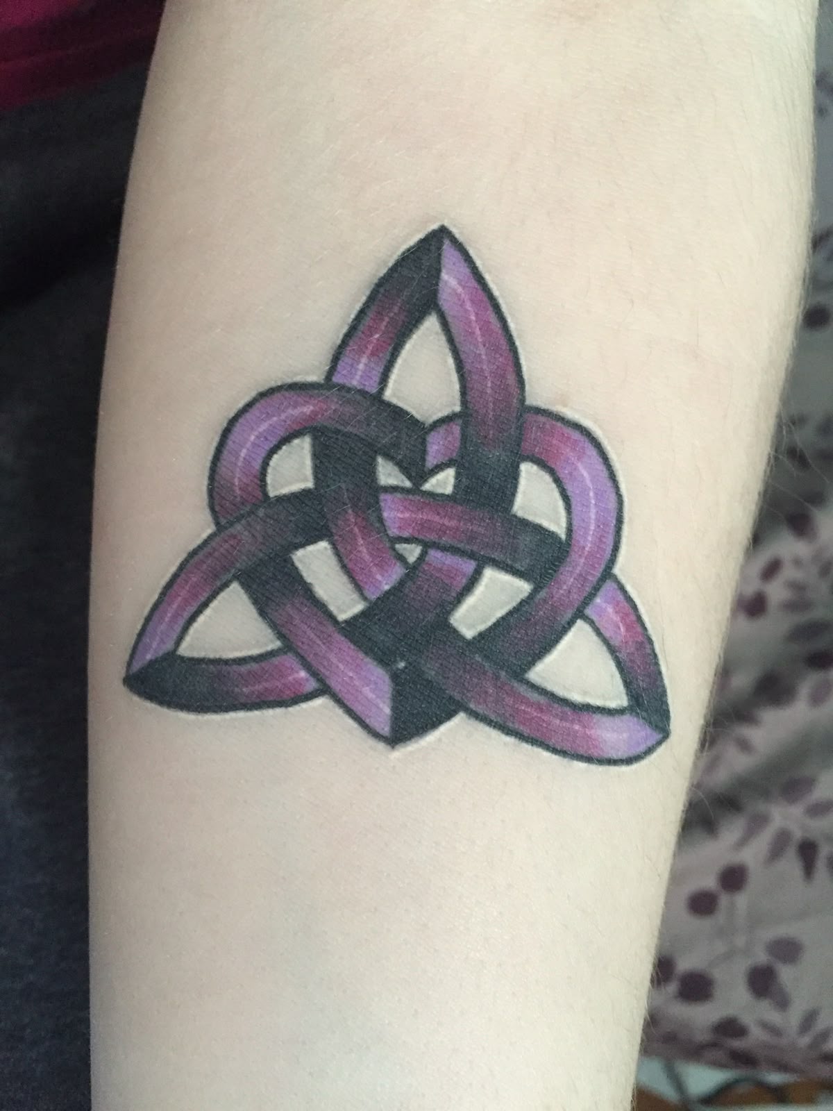 With its vibrant purple shading and dimensional highlights, this triquetra feels downright magical. The color gives it a modern twist while keeping the shape instantly recognizable. It’s the kind of tattoo that feels expressive and bold without needing anything extra around it.