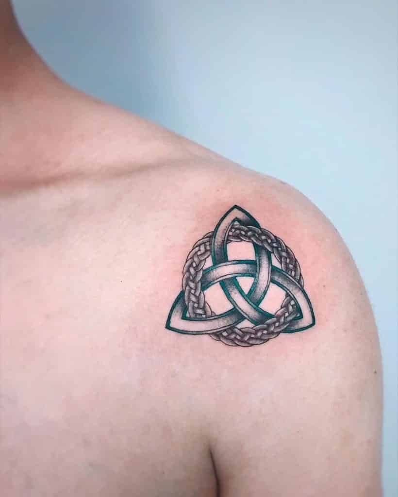 There’s something quietly enchanting about this braided Trinity knot resting on the shoulder. The woven texture gives it a softness—almost like the symbol has been crafted out of something living. The subtle color shading makes it feel like a piece of artwork that moves with your body, catching light in such a flattering, stylish way.