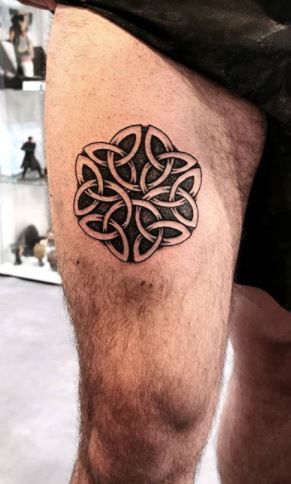 This quaternary knot makes such a bold visual statement with its dark, smoky background and crisp, pale lines weaving forward. It almost glows from the center, giving it a mysterious, powerful aura. If you love tattoos that look like they’re alive with energy, this one is unforgettable.