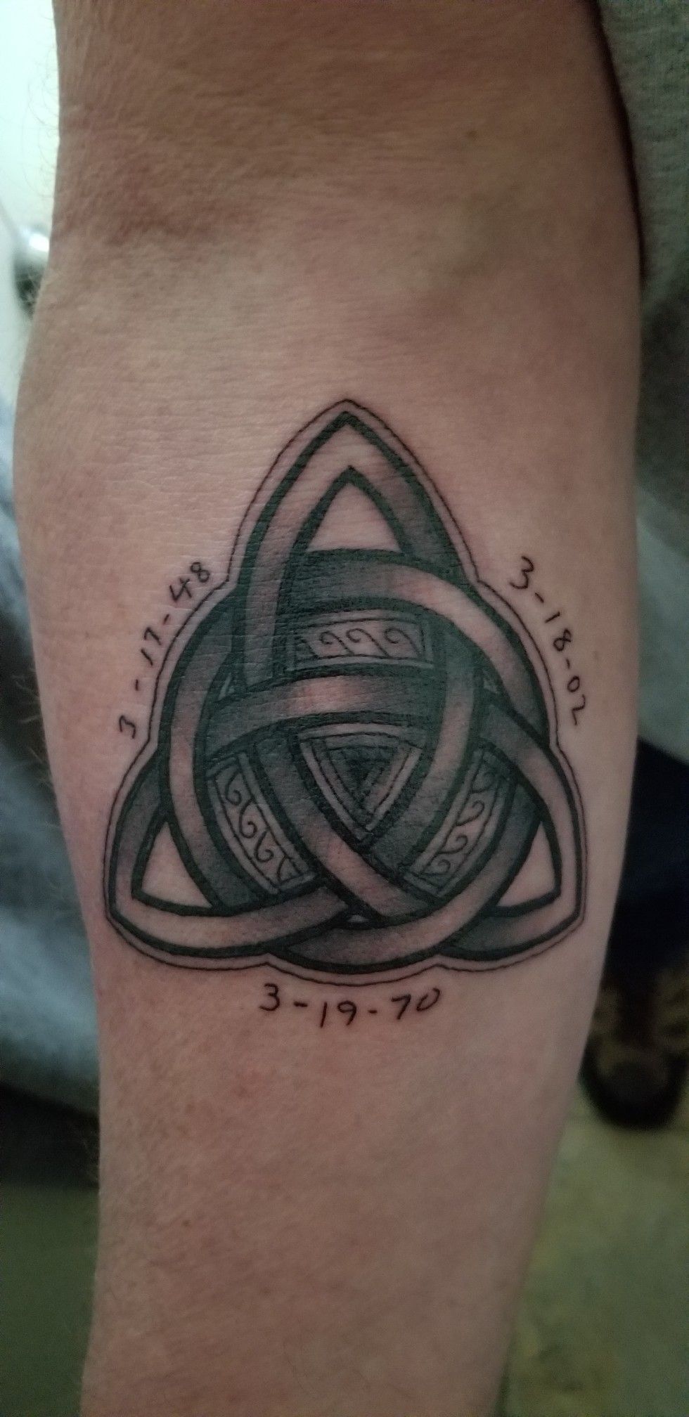 This Trinity knot wrapped in meaningful dates carries a quiet emotional weight—like a tribute you hold close in a form that feels both timeless and heartfelt. The clean loops frame the numbers beautifully, turning the whole tattoo into a symbol of connection, memory, and family stories that deserve to be honored.